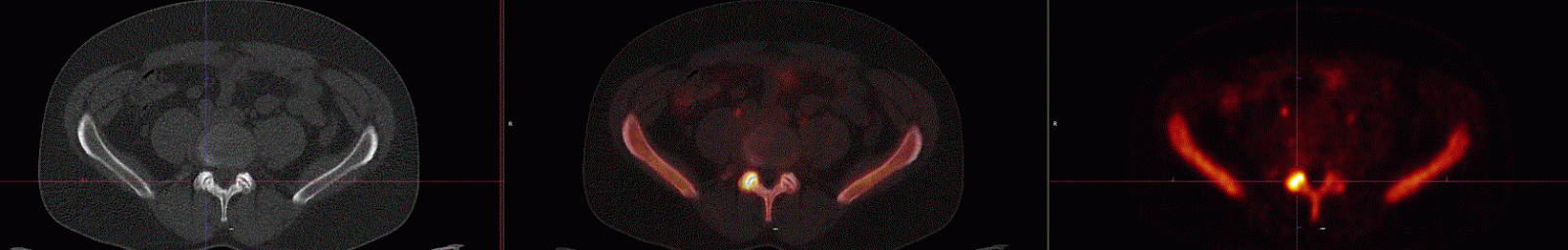 Vlevo CT složka, vpravo PET složka a uprostřed fúze hybridního PET/CT vyšetření. V horní řadě je transverzální řez (pohled odspodu) vedený intervertebrálním skloubením L4/5, kde je vpravo patrna intenzivní akumulace radiofarmaka. Ve spodní řadě je koronární řez (pohled zepředu), kde je vlevo při intervertebrálních plochách obratlů L5 a S1 rovněž patrna intenzivní akumulace radiofarmaka. Obě ložiska představují vysokou osteoblastickou aktivitu při aktivních degenerativních změnách.